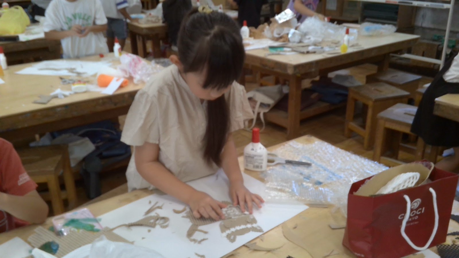 でこぼこしている色々な素材を組み合わせて版画の版を作っています。